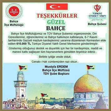 Bahçe İlçe Müftülüğü ve TDV Bahçe Şubesi öncülüğünde ve organizesinde Gazze yararına tertip edilen kermesten elde edilen 610.000 TL Türkiye Diyanet Vakfı'na gönderilmiştir..