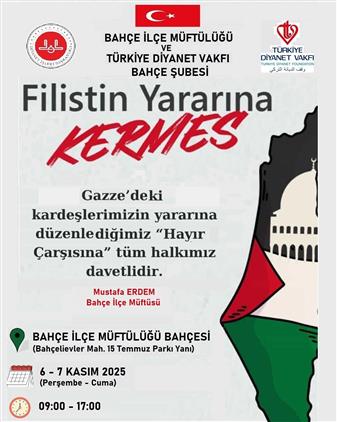 Bahçe İlçe Müftülüğümüz ve TDV Bahçe Şubemiz organizesinde Gazze yararına gerçekleştirilecek olan kermese tüm kardeşlerimiz davetçi ve davetlidir..