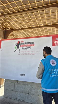 Millet Bahçesi içerisinde yer alan Cebeli Bereket Camii bahçesinde gerçekleştirilen etkinlikte öğrenciler, cami görevlileri, manevi danışmanlar ve cemaat, Filistin halkına yönelik zulme dikkat çekmek ve dayanışma mesajı vermek amacıyla hazırlanan duvara duygu ve düşüncelerini yazdılar.